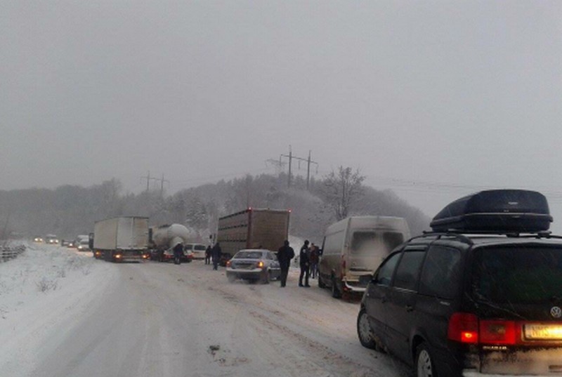 Фури повнісю перекрили дорогу, ймовірно одна зупинились, бо не змогла продовжувати рух на підйомі через слизьку дорогу, а друга її об’їжджала, однак зупинилась на її рівні. Внаслідок цього дві смуги перекриті, а на дорозі утворилися величезні затори.