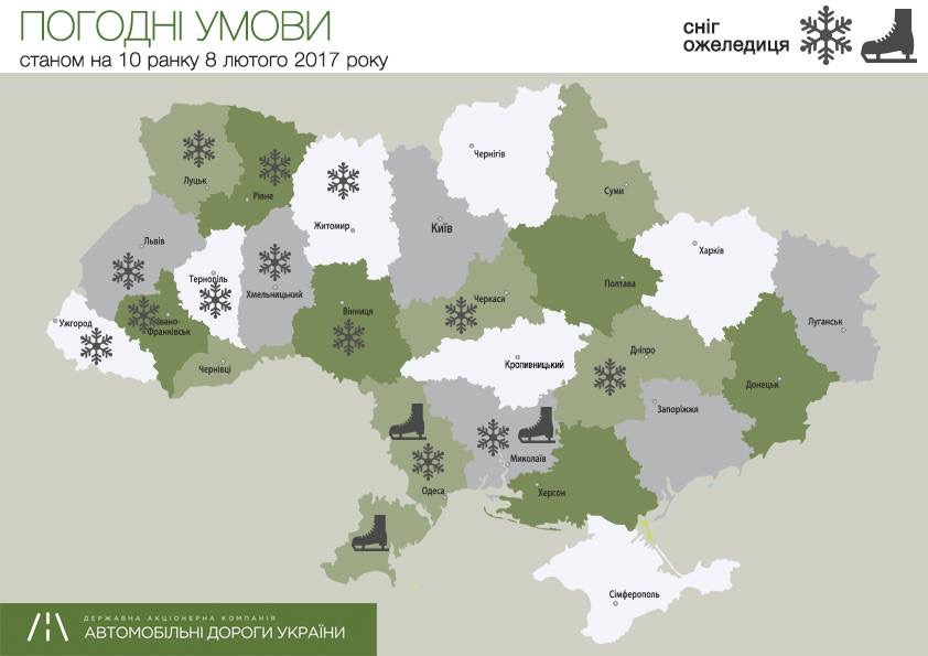 Станом на 10 ранку 8 лютого сніжити продовжує у 13 регіонах. Ожеледиця спостерігається на Одещині та Миколаївщині.