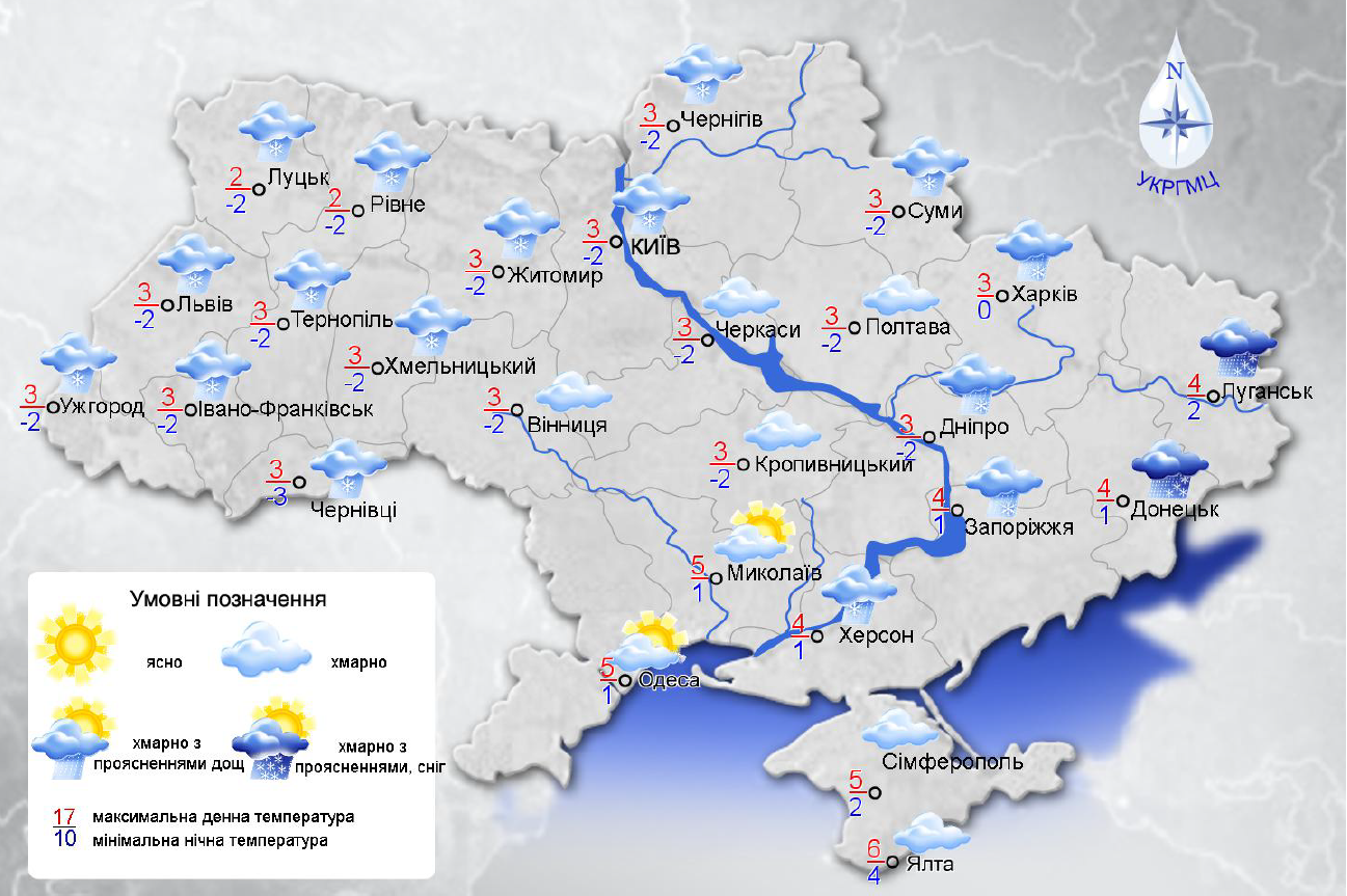 21 листопада у Дніпропетровській, Запорізькій та Херсонській областях дощ, місцями з мокрим снігом, вдень на Донеччині та Луганщині сильні опади, у західних та північних областях місцями невеликий мокрий сніг.