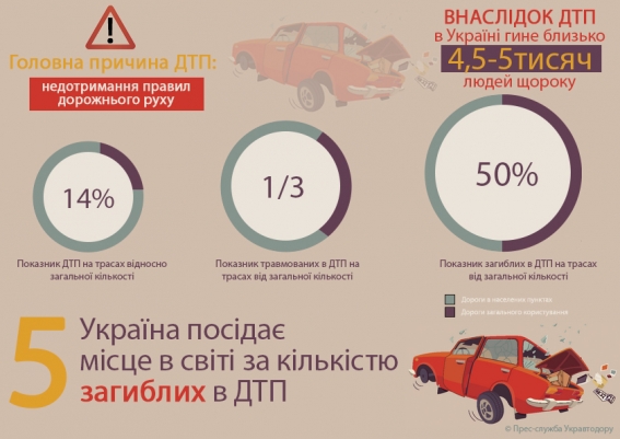 Примітно, загальна кількість аварій на дорогах загального користування незначна – вона становить близько 14% від усіх ДТП, що стаються на українських дорогах. Тобто, в містах потрапити в дорожньо-транспортну пригоду легше, та натомість, на трасах вони призводять до більш складних наслідків.