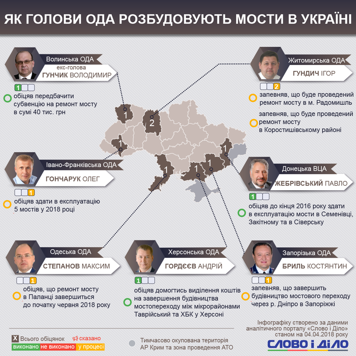 Грандіозні плани щодо мостів у голів обладміністрацій на цей рік. Голова Івано-Франківської ОДА Олег Гончарук обіцяв здати в експлуатацію цілих п'ять. Два мости планують відремонтувати в Житомирській області – в Радомишлі та в Коростишівському районі.