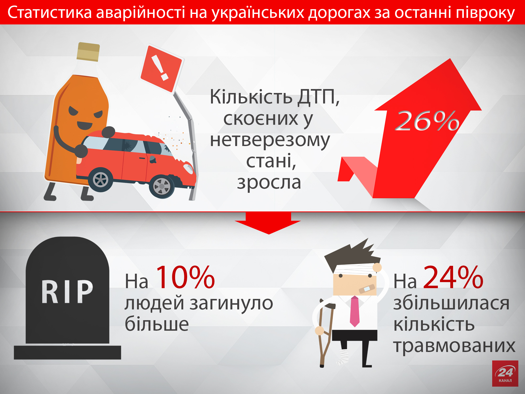 За даними Управління безпеки дорожнього руху України, за останні півроку кількість ДТП, скоєних у стані алкогольного сп'яніння, збільшилася близько на 26%. Тобто, фактично на третину. В таких ДТП на 10% більше загинуло людей і на 24% підвищилася кількість травмованих. Водночас, це лише офіційна статистика й невелика частина усього дорожнього "айсбергу".