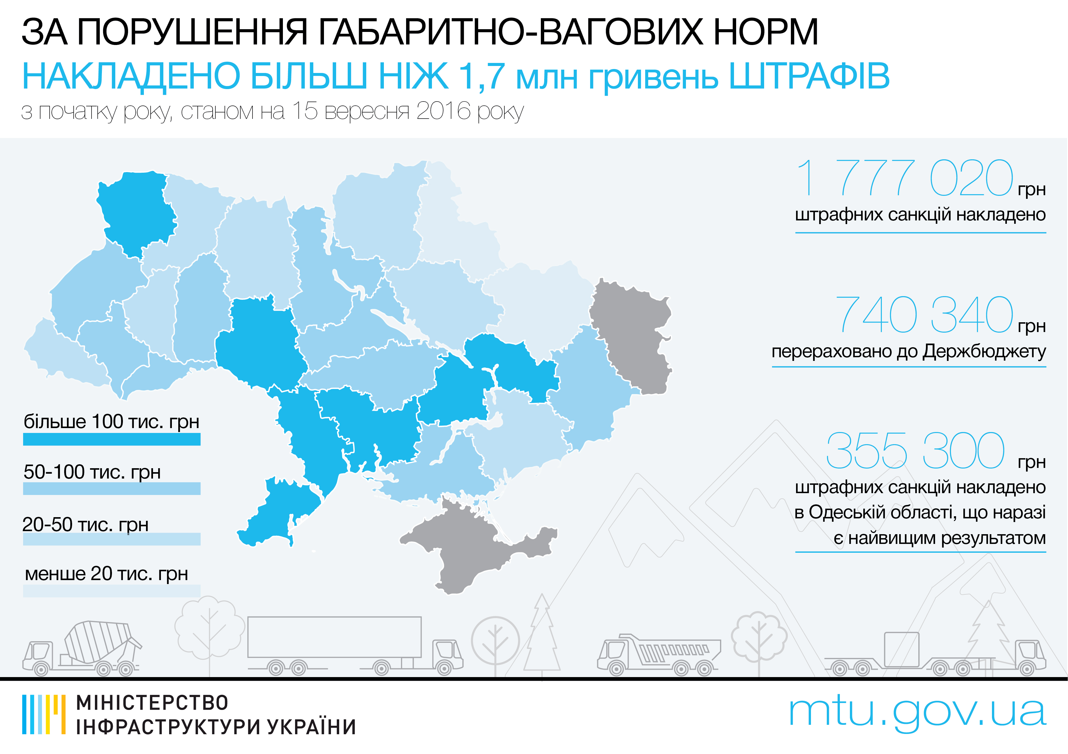 Абсолютним лідером стала Одеська область, де наразі вже накладено 355 300 грн штрафів за перевищення габаритно-вагових норм.